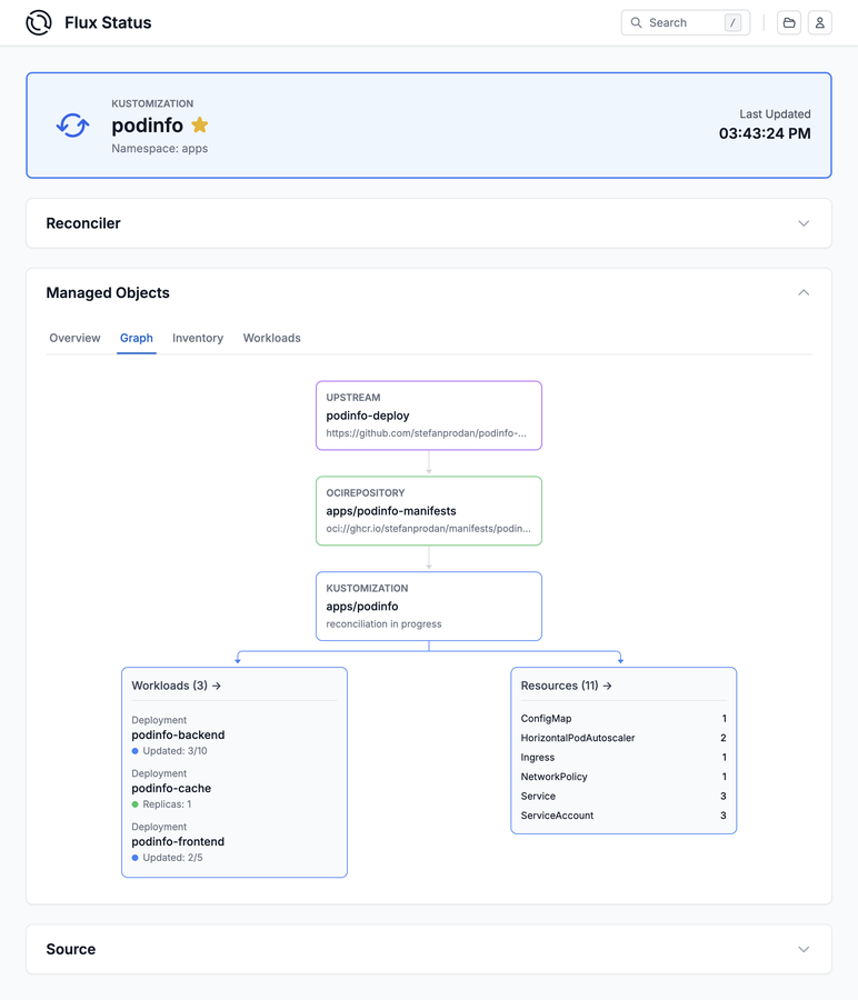 • Deep-dive views for ResourceSets, HelmReleases and Kustomizations